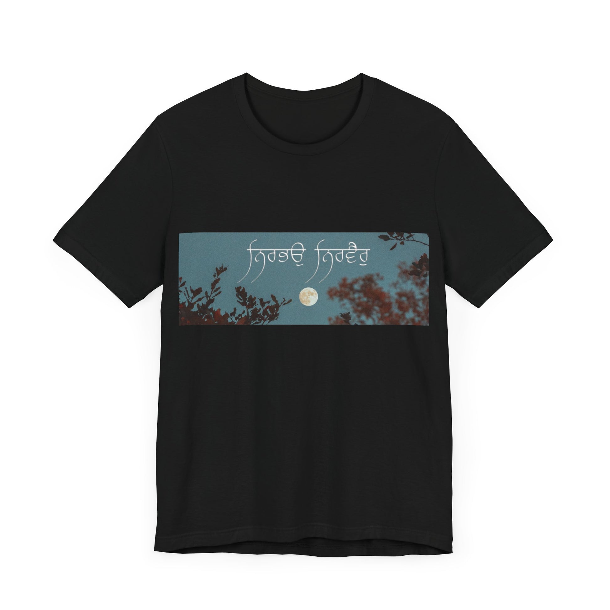 Wear the powerful message of Nirbhau Nirvair (ਨਿਰਭਉ ਨਿਰਵੈਰ) – meaning "Without Fear, Without Hate" – a core principle of Sikh philosophy. This bold and meaningful design features elegant Gurmukhi script against a serene, moonlit backdrop, symbolizing peace, strength, and unwavering courage.